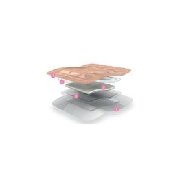 Super Absorbent Gentle Border KerraFoam Dressing is constructed of five unique layers that provide comfort and protection against the formation of pressure ulcers. The first layer is a smooth outer film that slides and protects to reduce shear and friction. The second layer provides a soft inner pouch that allows all the layers to move freely and prevent damage to peri-wound skin. The third layer is an absorbent core that locks in exudate even under compression. The fourth wicks away moisture horizontally and increases absorption capacity. The fifth layer of the Kerraform Gentle Border Foam Dressing is constructed from soft silicone and provides gentle adhesion with non-traumatic removal.
