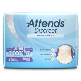 Make sure to choose the best size and fit of the disposable Attends Discreet Underwear. Available in Medium, Large and X-Large, the size is based on a women's waist measurement. You may also want to consider the Day/Night option for super absorbency protection at night. Attends also manufactures premium Attends Premier Underpads that can further protect any surface such as the mattress, automobile seat, or chair.