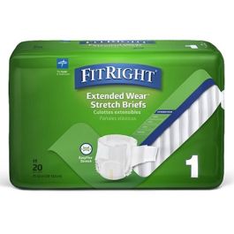 Medline FitRight Extended Wear Stretch Briefs, previously FitRight Extended Wear Briefs, provide the same maximum overnight absorbency with a new EasyFlex side panel. This new stretchable side panel provides a secure and customized fit to reduce the number of inventory sizes needed to accommodate patients and residents. The high-performance overnight absorbency is the same for dependable protection day or night. The brief features high-tech polymers within its core that absorb and lock away large volumes of fluid to reduce the risk of skin maceration and a breathable backsheet, which allows air to easily flow throughout the brief. Medline Extended Wear Stretch Briefs have odor protection within their core and anti-leak guards to help reduce leakage. The stretchable EasyFlex sides allow for unlimited adjustments. The front of the brief has a wetness indicator that helps alert a caregiver when it's time to change the brief. Vitality offers a wide variety of pull-on underwear or briefs so there is something to match each individual's needs. FitRight Conversion: MTB80200 Small converts to FITULTRASM MTB80300, MTB80500, and MTB80600 convert to FREW1 and FREW2