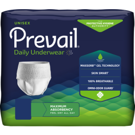 Prevail Unisex Underwear is highly absorbent. The underwear has MaxSorb Gel technology that turns liquid into gel and locks it in place, ensuring that the wearer remains dry and comfortable. Elastic leg gathers offer further assistance to keep any leaks inside the underwear.