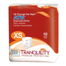 Tranquility ATN All-Through-the-Night Disposable Briefs Overview Tranquility ATN Diapers offer a dependable and comfortable solution for individuals and caregivers managing incontinence. These disposable briefs are top sellers for overnight wear due to their poly backing, core, and absorbency to provide reliable overnight protection with Kufguards® that channel urine. The super absorbent core holds over a quart of fluid, preventing leaks during sleep. The wetness indicator and adjustable tabs make it easy for caregivers to manage and change the briefs, ensuring proper use and hygiene. Users maintain their daily activities with confidence, knowing they have maximum protection. Vitality Medical offers a variety of adult diapers with tabs . Provide a reliable and comfortable solution for incontinence management and buy Tranquility ATN Disposable Briefs today!