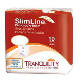 Tranquility SlimLine Briefs Overview Tranquility SlimLine Disposable Briefs conform to the body for a comfortable fit while providing heavy absorbency. The peach core contains superabsorbent polymers that guarantee skin dryness and odor reduction by locking urine into the core and neutralizing its pH level. The SlimLine Original Disposable Briefs feature a wetness indicator in the front that turns from yellow to blue when moisture is present. This visual queue signals when it is time to change the adult brief , eliminating unnecessary changes and reducing costs. Tranquility's Kufguards inner leg cuffs channel fluids into the core, helping to contain high-volume urge episodes and bowel incontinence. Multiple sizes are available for youth and adults, ensuring fitted and comfortable wear around the waist. In addition to briefs, Vitality Medical features a full line of adult diapers .