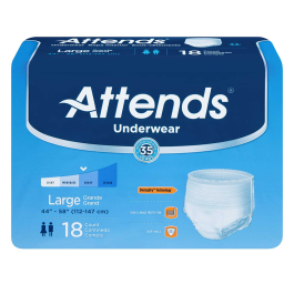 Attends Protective Underwear with moderate absorbency is made with a soft elastic waist design that provides superior comfort. Tear-away sides offer an easy option for removal. This adult protective underwear is white in color for added wearer discreetness. Colored stitching indicates back of product . New additional inner acquisition layer for faster absorbency. Packaged in discreet outer carton. Attends Protective Underwear Features & Benefits Contains additional super absorbent polymer and cellulose fibers for EXTRA absorbency. Stretchable comfort-fit belly and waistband elastics. Breathable, air-flow material to promote drier, healthier skin. Cloth-like material for discreet wear. Acquisition layer and super absorbent polymer channel and lock fluids in the core and helps prevent odor. Color stitching indicates back of product. Attends Protective Underwear Specifications Attends Protective Underwear Product Numbers: AP0720, AP0730, AP0740. Sizes: Medium, Large, X-Large. Sizing Ranges Waist / Hip: 34-44 Inch, 44-58 Inch, 58-68 Inch. Absorbent Capacity: Moderate Absorbency. Application: Protective Underwear. Backing Material: Cloth-like. Color: White. Gender: Unisex. Leg Style: Elastic Gathers. Style: Pull on. Topsheet Material: Nonwoven. Type: Brief. Disposable. Users: Adults. Brand: Attends®. Manufacturer: Attends Healthcare Products. UNSPSC Code: 53102303. HCPCS Code: A4520. Vitality Medical carries a wide variety of Adult Pull Up Diapers in stock. Find the perfect incontinence product today!
