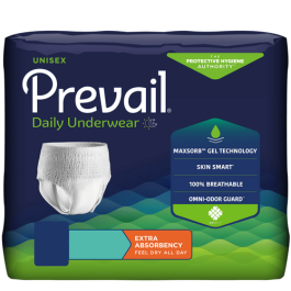 Prevail Extra Absorbency Underwear Overview Prevail Extra Absorbency Daily Underwear pull-on disposable briefs protect users from leaks that come from incontinence. The briefs contain Maxsorb Gel, which locks away moisture from the skin to keep users dry throughout the day. The special gel is not only able to lock away moisture but will also lock away odors. This allows users to continue life and activities without fear or shame that can be caused by leaks. In addition, the briefs are created with Skin Smart fabric that wicks moisture away from the skin and is cloth-like on the outer layer. This prevents rustling usually caused by adult diapers and further increases the subtlety of the underwear. The Prevail Protective Underwear is breathable and comes in several sizes to ensure the best fit. Choose from a Youth/Small (PV-511), Small/Medium (PV-512), Large (PV-513), or X-Large (PV-514). Corresponding waist measurements are found above when ordering. Order your Prevail Extra Absorbency Daily Underwear today and experience the comfort and protection they provide.