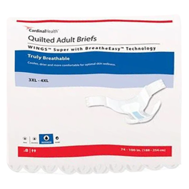 Wings Bariatric Adult Briefs , manufactured by Covidien , are maximum absorbency briefs that have been fully redesigned to deliver an enhanced fit, better coverage and leakage protection. Featuring larger and flexible side panels, this brief will now accommodate waist ranges up to 100 inches. In addition, the stretchable material allows for a more unique and contoured fit. Due to over-sized tabs, the wearer or caregiver will be able to fasten the tab anywhere on the anterior of the brief. The fastening system is almost effortless to reposition and apply, so that changing requires less effort. The side panels are made of a porous material, which allows air to freely pass through keeping skin dry, cool and comfortable. The material, additionally, is uniquely bonded that presents an incredibly soft feel against the skin. The bond also allows the brief to be quiet, which enhances the dignity and comfort of the wearer. The new and improved brief features a contoured mat design. Specifically, it has a high level of super absorbent polymers to provide added dryness and odor control. To control the dryness of the brief, it has a high performance blue dryness strip that acquires and disperses fluid into the core. Additionally, it will wick away moisture for improved comfort and skin protection. It also has elastic leg gathers that will ensure leakage protection to help keep the wearer dry. The brief features a wetness indicator on the front which will alert the caregiver that it is time for a new brief. Truly, the New and Improved Wings Bariatric Adult Briefs are a great choice for minor to heavy incontinence . Wings Bariatric Adult Briefs Features and Benefits Cloth-like Backing. Contoured Mat Design. Elastic Leg Gatherers. High performance Blue Dryness Strip. Highly Absorbent. Manufactured in the United States. Robust Fastening System. Spun-bound, Non-woven Top Sheet. Stretchable Side Panels. Wetness Indicator on Front. Wings Bariatric Adult Briefs Specifications Product Number: 67095. Waist Size: 74 to 100 inches. Style: Unisex. Application: Incontinence Protection. Manufacturer: Covidien. HCPCS Code: T4543.